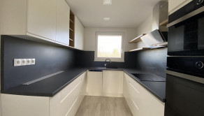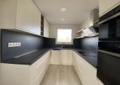 - nová kuchynská linka s dvierkami s tichým dovieraním, v prevedení biela matný v kombinácii s drevenou pracovnou doskou so zabudovanými spotrebičmi